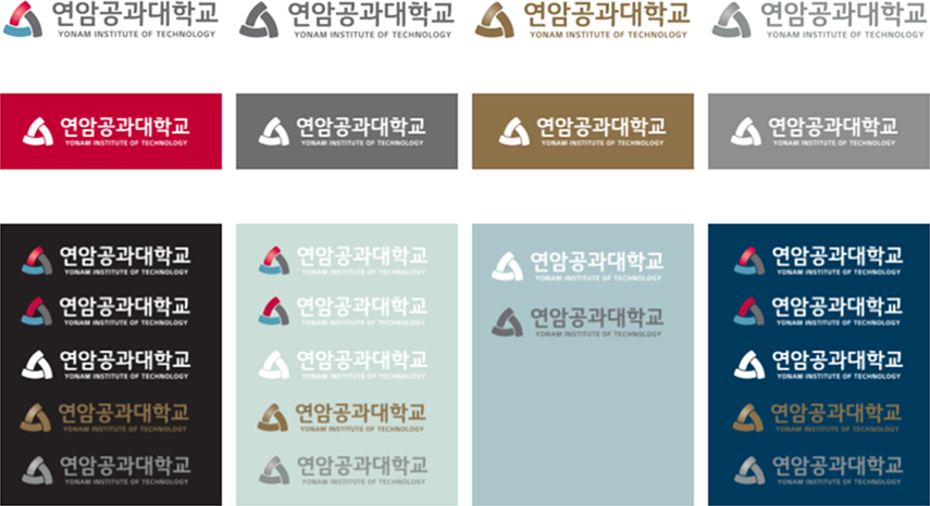 시그니처는 심벌마크와 연암공과대학교 대학명 로고를 조합한 것으로써 아이덴티티의 요소중 가장 빈번히 사용되는 것으로, 배경색에 따라 사용할 수 있는 색상규정을 준수하여 사용함에 있어 오용이 생기지 않도록 철저히 관리합니다.
